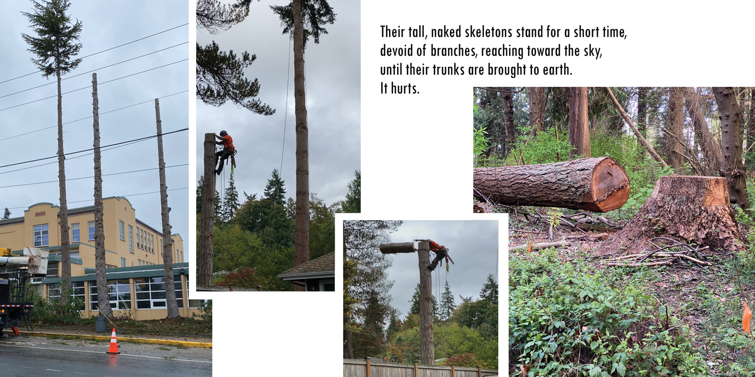 I am working in my city to keep giant, gorgeous trees from being slaughtered needlessly. This newfound knowledge that I owe my very existence to trees has given more emotional power to my work. It hits me deeply when I look at trees being cut down. The tall skeletons of their trunks stand for a short time, devoid of branches, reaching toward the sky. It hurts to see them naked of their green. It hurts even more to watch the chainsaws fell them completely.